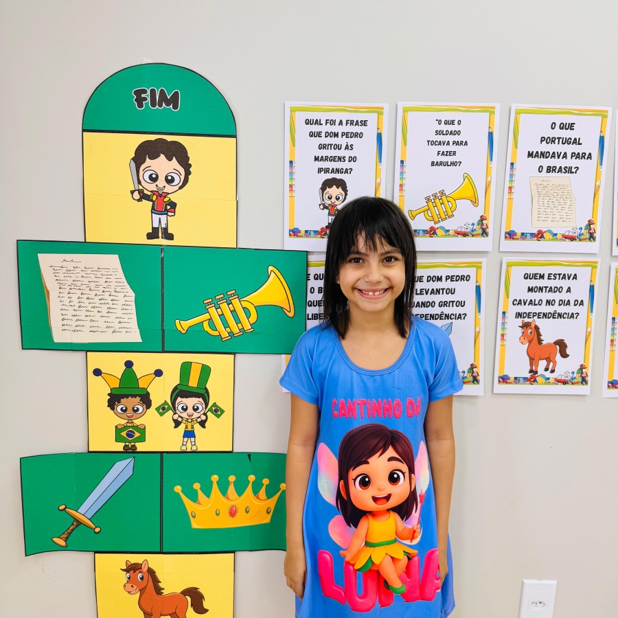 A criança joga a pedrinha, vê em qual imagem caiu e vai pulando até chegar lá. Cada desenho está ligado a um cartaz com uma perguntinha sobre a Independência do Brasil. Quem chega, lê (ou ouve) a pergunta e responde!