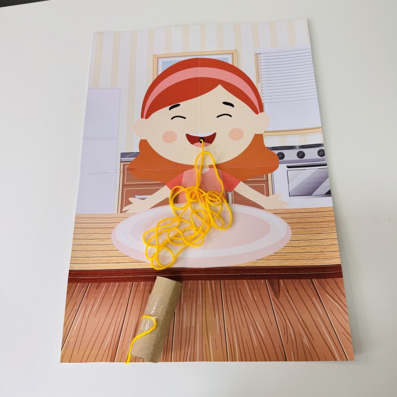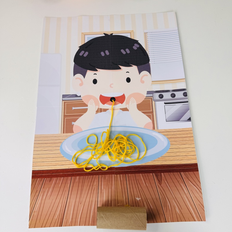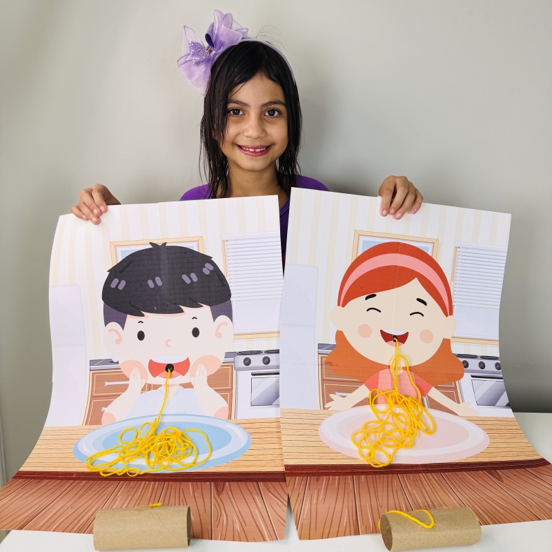 O objetivo é enrolar o “macarrão” (barbante) e ver quem consegue “comer” primeiro. Simples, criativo e perfeito para deixar a aula muito mais animada.