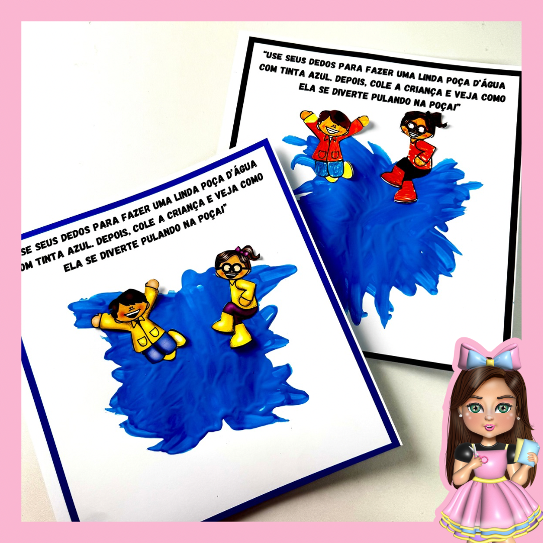 💦 Poça d’Água Interativa – As crianças usam tinta azul e os dedinhos para criar uma poça d’água e depois colam os personagens para simular o pulo na poça!