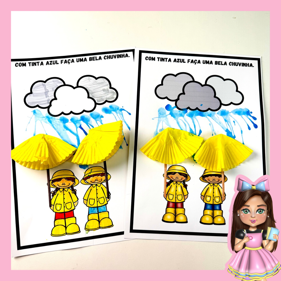 ☔ Chuvinha Criativa – Aqui, o guarda-chuva é feito com forminhas de doce! A criança sopra tinta azul para formar a chuva e completa a cena de um dia chuvoso!