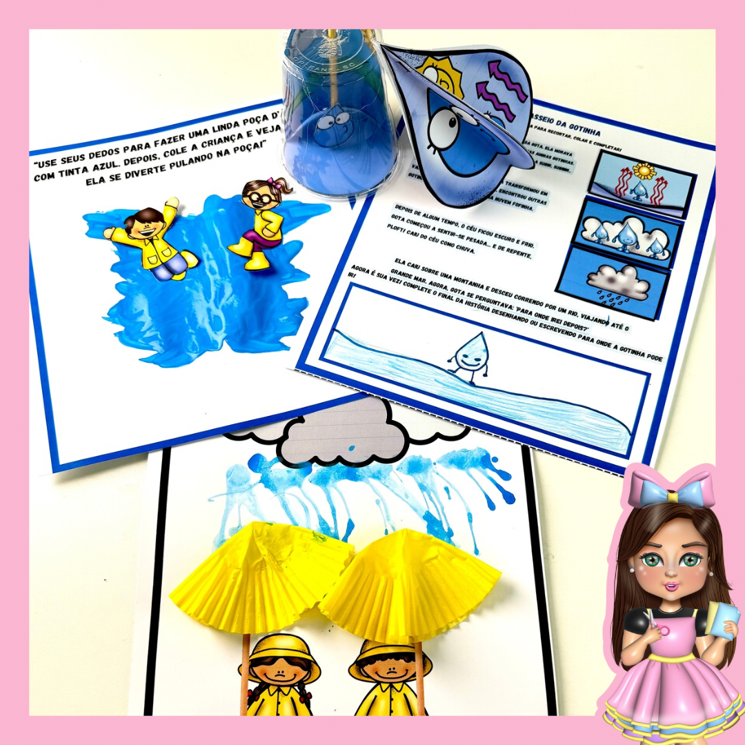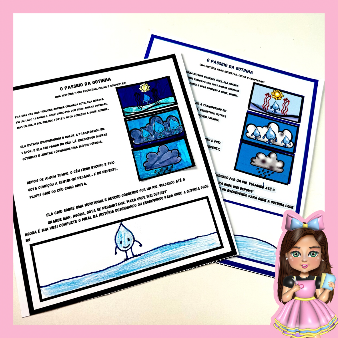 🎭 Jornada da Gotinha – Uma história interativa onde as crianças recortam e colam as cenas na ordem correta e ainda desenham o final da aventura da gotinha!