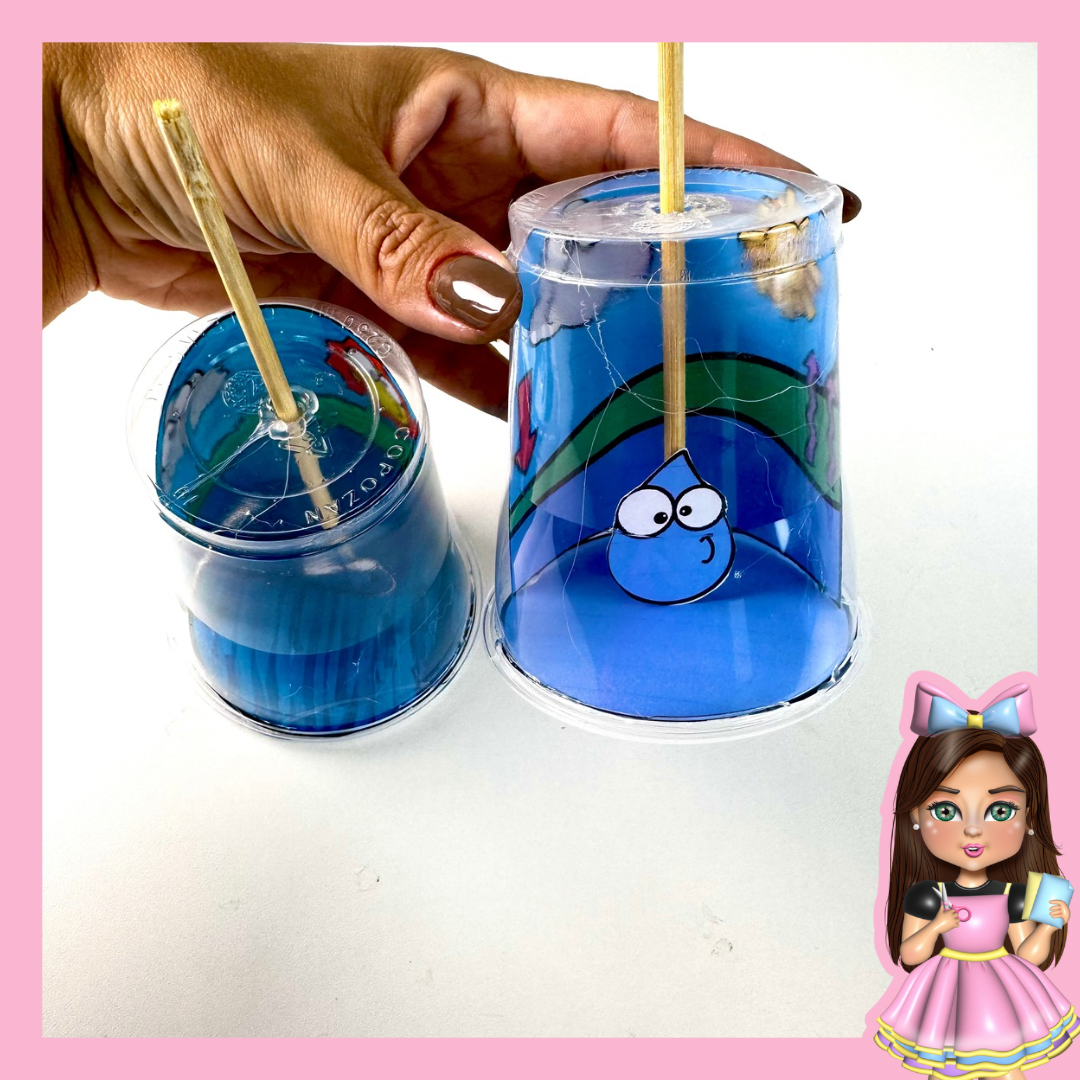 🌊 Copinho Interativo do Ciclo da Água – A gotinha sobe com o palito até o sol, se junta às nuvens e depois desce como chuva de volta para o lago! Um jeito prático e visual de aprender o ciclo da água!