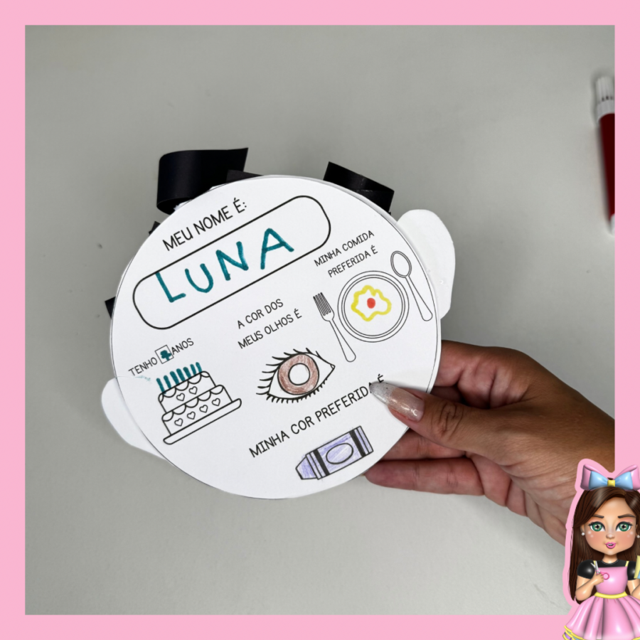 As crianças vão desenhar o próprio rostinho, criar cabelinhos cheios de estilo e, no verso, escrever sobre si mesmas: nome, idade, cor dos olhos, comida preferida e cor favorita! 🖍️💡